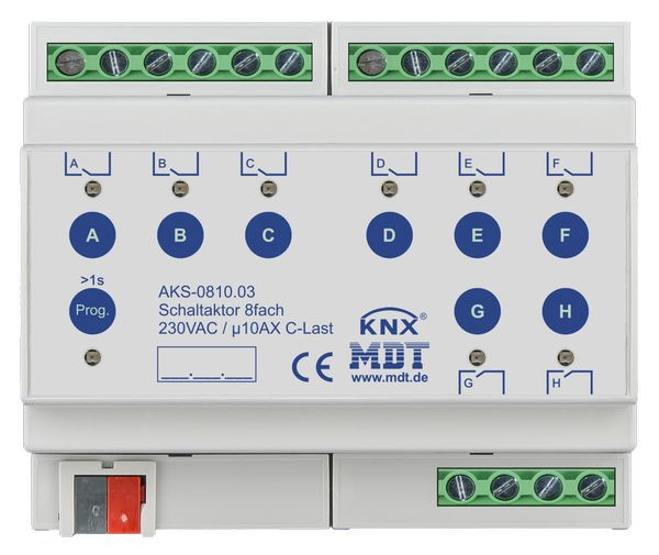 | Kurzbeschreibung | KNX Schaltaktor 8-fach, 6TE REG, 10 A, 230 V AC, C-Last, Standard, 140 µF |