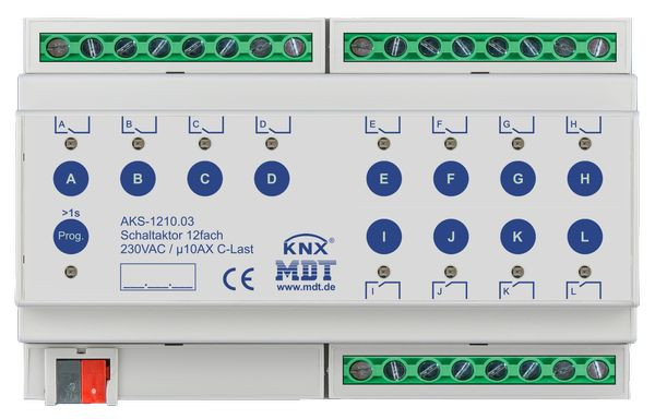 | Kurzbeschreibung | KNX Schaltaktor 12-fach, 8TE REG, 10 A, 230 V AC, C-Last, Standard, 140 µF |