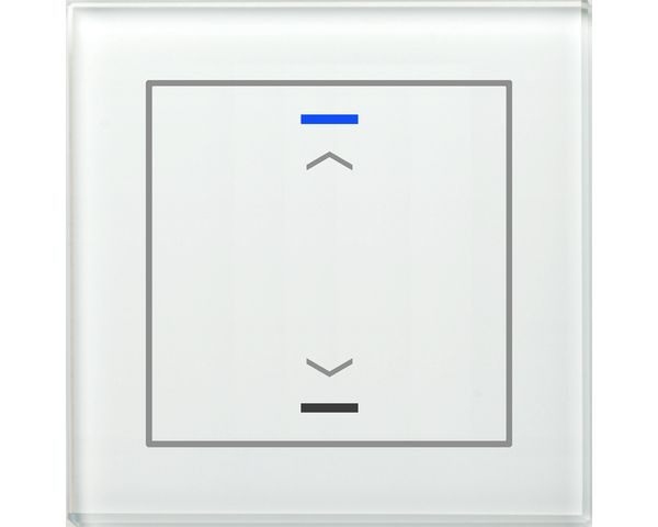 KNX Glastaster II Light 1-fach, RGBW, Weiß, Jalousie. Ausführung Auf/Ab Symbol mit 1 Tastenpaar / 2 Sensorflächen. Umfangreiche Applikation. Die Tasten sind als Tastenpaar oder Einzeltasten frei einstellbar. Ein- und Zweitasterbetrieb für Schalten, Dimmen, Jalousie, Werte. Umschalten von bis zu vier Werten oder Szenen. Kurzer/Langer Tastendruck mit 2 Objekten. Mehrfach-Tippfunktion sendet bis zu 4 Werte auf gleiche oder verschiedene Objekte. Innovative Gruppensteuerung mit langem/extra langem Tastendruck. Patschfunktion mit zusätzlichem Schaltobjekt. Zwei RGBW Status-LEDs. LED Helligkeit über Tag/Nacht- oder Helligkeit-Objekt steuerbar. 4 Logikblöcke. Einbau in Schalterdose mit mitgeliefertem Tragring. Abmessungen (H x B): 92 x 92 mm. Integrierter Busankoppler. 3 Jahre Produktgarantie.