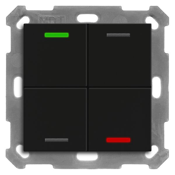 KNX Taster Light 55 4-fach, RGBW, Temperatursensor, Schwarz matt, Neutral. Ausführung Neutral mit 4 Tasterflächen und Temperatursensor. Passend für 55 mm Schalterprogramme z. B. MDT Sortiment 55 oder GIRA Standard 55, E2, Event, Esprit oder BERKER S1, B3, B7 oder JUNG A 500, A PLUS, A CREATION, AS 500, A 550, A FLOW oder MERTEN 1M, M-Smart, M-Plan, M-Pure. Mehrfach-Tippfunktion sendet bis zu 4 Werte auf gleiche oder verschiedene Objekte. Innovative Gruppensteuerung mit langem/extra langem Tastendruck. Eintasterbetrieb für Schalten, Dimmen, Jalousie, Werte. Umschalten von bis zu vier Werten oder Szenen. Kurzer/Langer Tastendruck mit 2 Objekten. Vier RGBW Status-LEDs. LED Helligkeit über Tag/Nacht- oder Helligkeit-Objekt steuerbar. Integrierter Busankoppler. 3 Jahre Produktgarantie.