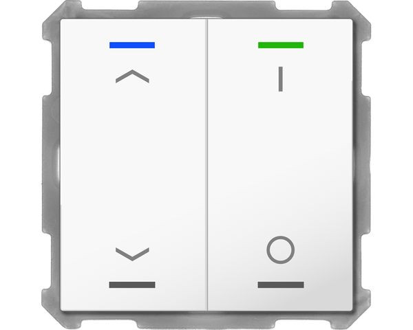 KNX Taster Light 63 2-fach, RGBW, Studioweiß glänzend, Jalousie_Schalten. Ausführung Auf/Ab und I/O Symbol mit 2 Tastenpaaren / 4 Tasterflächen. Passend für 63 mm Schalterprogramme, z. B. MDT Sortiment 63 oder Busch-Jaeger future linear, solo, carat und Busch-axcent. Die Tasten sind als Tastenpaar oder Einzeltasten frei einstellbar. Ein- und Zweitasterbetrieb für Schalten, Dimmen, Jalousie, Werte. Umschalten von bis zu vier Werten oder Szenen. Kurzer/Langer Tastendruck mit 2 Objekten. Innovative Gruppensteuerung mit langem/extra langem Tastendruck. Mehrfach-Tippfunktion sendet bis zu 4 Werte auf gleiche oder verschiedene Objekte. Zwei RGBW Status-LEDs pro Tastenpaar. LED Helligkeit über Tag/Nacht- oder Helligkeit-Objekt steuerbar. 4 Logikblöcke. Einbau in Schalterdose mit mitgeliefertem Tragring. Integrierter Busankoppler. 3 Jahre Produktgarantie.