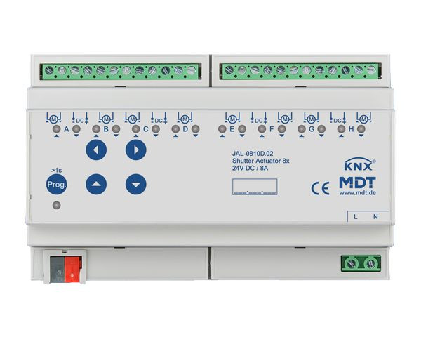 Jalousieaktor für Rollladenmotoren 24VDC bis 180W, Mit monostabilen Relais, Strom max. 8A bei ohmscher Last, Taster für Handbetrieb und LED Anzeige pro Ausgang, Betriebsart Jalousie/Rolllade programmierbar, Lauf-, Pausen- und Schrittzeit frei programmierbar, 1-bit Automatiksteuerung und Sonnenschutzfunktion, 8-bit Positionierung für Höhe und Lamelle, 8 Szenen pro Kanal, Alarm-, Zentral- und Sperrfunktionen, Getrennte Verfahrzeit für Auf/Ab einstellbar, Tastbetrieb zur genauen Positionierung, Für DC-Motoren mit 2 Anschlüssen, Integrierte Polwendeschaltung, Programmierbares Verhalten bei Busspannungsausfall/-wiederkehr, Reiheneinbaugerät für 35mm Hutschiene, Integrierter Busankoppler, 3 Jahre Produktgarantie