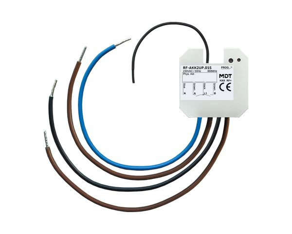KNX RF+ Schaltaktor 2-fach, UP, 10 A, 230 V AC, Secure. Ausführung mit monostabilen Relais. Strom max. 10 A bei ohmscher Last, 10 A bei 14 µF / 2 EVG. Zum Einbau in die Schalterdose. Zum Betrieb innerhalb der EU, 868 MHz. KNX RF+ Protokoll im System Mode. KNX Data Secure. Inbetriebnahme ab ETS 5. Schließer- und Öffnerbetrieb. Zeitfunktionen (Ein-/Ausschaltverzögerung, Treppenlichtfunktion). Status Rückmeldungen für alle Kanäle (aktiv/passiv). Logische Verknüpfungen. 8 Szenen je Kanal. Zentralfunktionen und Sperrobjekte zur Zwangsführung. Anbindung über MDT KNX RF+ Funk Linienkoppler. Zur Modernisierung ohne Verlegung von KNX-Buskabeln. Spannungsversorgung 230 V AC. Einbau in Schalterdose. Abmessungen (H x B x T): 41 x 41 x 22 mm. 3 Jahre Produktgarantie.