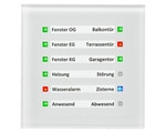 12 unabhängige voneinander schaltbare RGB LEDs, Indifiduell gestaltbares Beschriftungsfeld zum Einschieben unter die Glasfläche, 2 Objekte je LED, 4 Zustände je LED möglich (Wert=0, Wert=1, Prioritätsobjekt=1, Ausfall des Objekts) 8 Logikblöcke mit je 8 Eingängen, 4 Module zum Vergleichen von Telegrammen, Helligkeit in 2 Stufen einstellbar, Tag-/Nachtobjekt, Abschaltung/Reduzierung der Helligkeit, Anwesend/Abwesend Objekt, Ausfallüberwachung der Objekte mit Meldefunktion, Objekt mit Meldefunktion (z.B. Abwesend oder Fenster geöffnet), Abmessungen 92mm x 92mm, Integrierter Busankoppler.