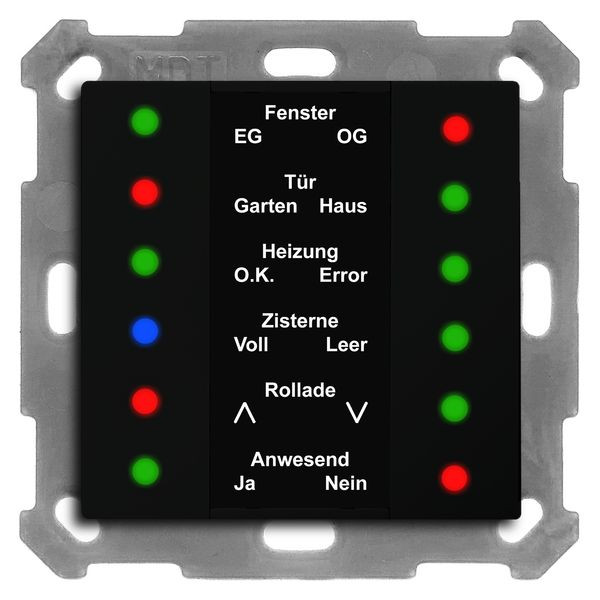 KNX LED Anzeige 55, Schwarz matt. Ausführung mit 12 RGB-LEDs. Passend für 55 mm Schalterprogramme z. B. MDT Sortiment 55 oder GIRA E2 oder BERKER B3, B7 oder JUNG A 550 oder Merten M-Pure. 12 schaltbare RGB Status-LEDs. Mittiges Schriftfeld mit Deckfolie zur individuellen Beschriftung. 3 Objekte je LED. 4 Zustände je LED möglich (Wert=0, Wert=1, Prioritätsobjekt=1, Ausfall des Objekts). 8 Logikblöcke mit je 8 Eingängen. 4 Module zum Vergleichen von Telegrammen. Helligkeit in 2 Stufen einstellbar. Tag/Nacht Funktion. Abschaltung/Reduzierung der Helligkeit. Anwesend/Abwesend Objekt. Ausfallüberwachung der Objekte mit Meldefunktion. Objekt mit Meldefunktion (z. B. Abwesend oder Fenster geöffnet). Integrierter Busankoppler. 3 Jahre Produktgarantie.