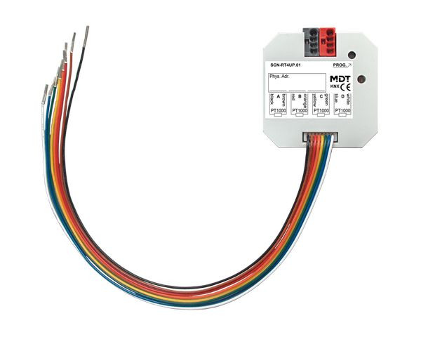 KNX Temperaturregler/Sensor 4-fach, UP, für PT1000 Temperaturfühler. Ausführung zur Messung der Innen-/Außentemperatur. Zum Einbau in eine Schalterdose. Wählbarer Reglertyp (2-Punkt, PI, PWM) oder Sensorbetrieb. Temperaturmessung erfolgt über externe PT1000 Fühler. Temperatur Min-/Max-Wertespeicher, Meldungen und Frost-/Hitzealarm. Zyklisches Senden einstellbar. Tag-/Nacht-/Frost-/Hitzeschutzbetrieb, Kühlfunktion. Status über HVAC und RHCC Objekte. Umschaltung der Betriebsart über Bit/Byte Objekte. Sollwertvorgabe über Visualisierung, z. B. MDT VisuControl. Einbau in Schalterdose. Abmessungen (H x B x T): 41 x 41 x 12 mm. 3 Jahre Produktgarantie. Zubehör:. Temperaturfühler PT1000 Standard, Anlegemontage oder zum Deckeneinbau.