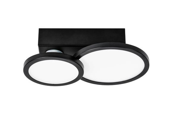 Bad-Deckenleuchte DISK-2 mattschwarz (1200 Lumen) mit zwei werkzeuglos wechselbaren LED-Lichtquellen mit Sockel GU10 (1 x 500 Lumen, 1 x 700 Lumen). Ideal fürs Bad durch Schutzart IP44. Breit abstrahlende Decken- und Wandleuchte zur Raumbeleuchtung. Blendungsarmes Licht durch LED-Mini-Panels und Diffusoren aus PMMA. Make-up-Licht-Funktion (Lichtfarbe umschaltbar). Anschlussklemme im Gehäuse mit Kabeleinführung. Auch in Chrom/Weiß lieferbar.