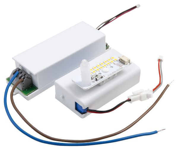 Notbeleuchtungsmodul mit Akkubatterie für bis zu 3 Stunden Leuchtdauer bei Netzausfall.