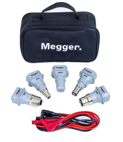 Das LA-KIT von Megger enthält fünf separate Lampenfassungs-Adapter. Damit können elektrische Prüfgeräte über 4-mm-Fassungen nach Industriestandard für Mess- und Prüfzwecke an den Stromkreis angeschlossen werden, ohne dass in die Leitungen oder das Lampengehäuse eingegriffen werden muss.
