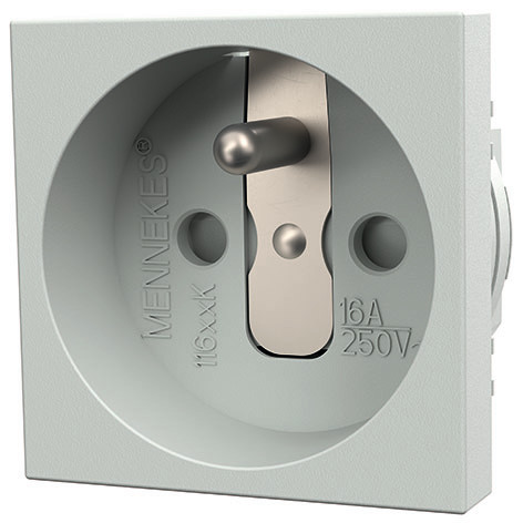 16A2P+E 230V Schutzkontakt-Steckdose weiss franzoesisch/belgische Norm, ohne Klappdeckel rastbar fuer Kanaleinbau mit Schraubklemme, mit integriertem erhoehtem Beruehrungsschutz Fl. 45 x 45 Leitungseinfuehrung von unten