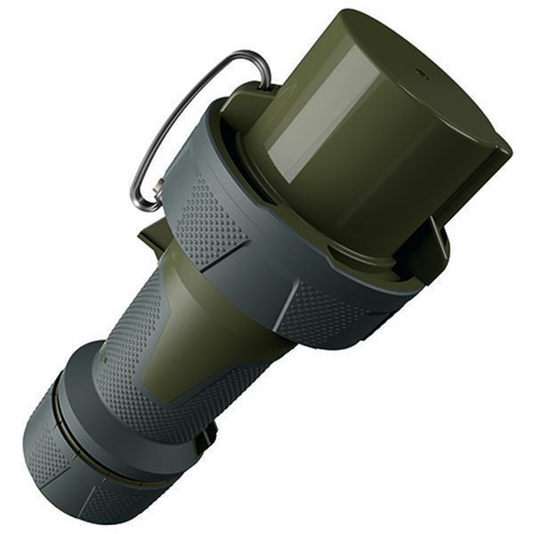 63A5P 2H>50V >300-500Hz Stecker PowerTOP Xtra TM IP 67 HW/VN, mit Schutzkappe und gummierten Griffflaechen Verschraubung mit integrierter Zugentlastung und Dichtung Gehaeuse mit Gewindeverschluss und Sicherungsschiebern Bronzegruen VG 96 919 CP 012