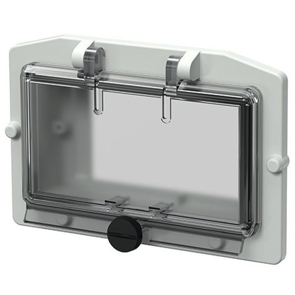 Scharnierfenster fuer 5 TE mit Beruehrungsschutz elektrograu, Rauchglas
