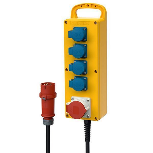 Gehäusegröße: 445 x 135 mm MENNEKES Leiste EverGUM tragbar anschlussfertig verdrahtet Schutzart IP 44 Gehaeuse: 1 Vollgummi-Gehaeuse 370X135x95 mm(LxBxH) signalgelb RAL 1003, mit Traggriff Bestueckung: Pos.01 1 CEE-Steckdose 16A 5p 400V Pos.02 4 SCHUKO-Steckdosen 16A 2p+E 230V Zuleitung/Anschlussmoeglichkeit: 1 M 25 mit Verschraubung und Knickschutzspirale 2m Zuleitung H07RN-F5G2,5 mit CEE-Stecker 16A 5p 400V