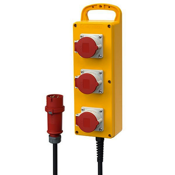 MENNEKES Leiste EverGUM tragbar anschlussfertig verdrahtet Schutzart IP 44 Gehaeuse: 1 Vollgummi-Gehaeuse 370x135x95 mm(LxBxH) signalgelb RAL 1003, mit Traggriff Bestueckung: 3 CEE-Steckdosen 16A 5p 400V Zuleitung/Anschlussmoeglichkeit: 1 M 25 mit Verschraubung und Knickschutzspirale 2m Zuleitung HO7RN-F5G2,5 und CEE Stecker 16A 5p 400V