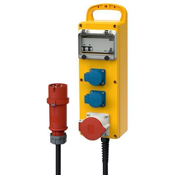 MENNEKES Leiste EverGUM tragbar anschlussfertig verdrahtet Schutzart IP 44 Gehaeuse: 1 Vollgummi-Gehaeuse 370x135x95 mm(LxBxH) signalgelb RAL 1003, mit Traggriff Bestueckung/Absicherung: Pos.01 1 CEE-Steckdose 32A 5p 400V Pos.02 2 SCHUKO-Steckdosen 16A 2p+E 230V 2 LS-Schalter 16A 1p B Pos.01-02 1 FI-Schutzschalter 40A 4p IFN=0,03A Zuleitung/Anschlussmoeglichkeit: 1 M 25 mit Verschraubung und Knickschutzspirale 2m Zuleitung 5 x 4 mm² mit CEE-Stecker 32A 5p 6H 400V