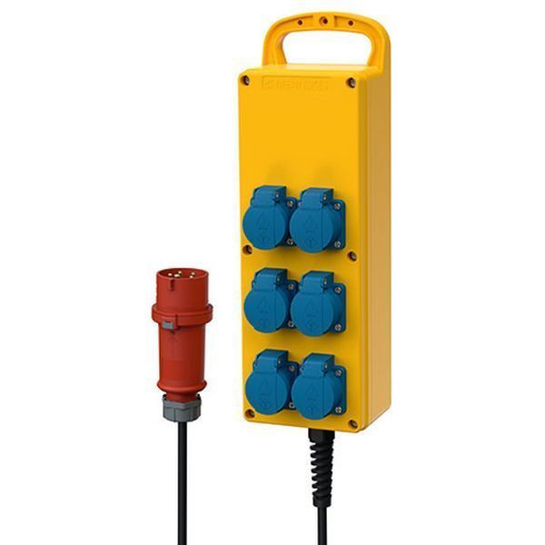 MENNEKES Leiste EverGUM tragbar anschlussfertig verdrahtet Schutzart IP 44 Gehaeuse: 1 Vollgummi-Gehaeuse 370x135x95 mm(LxBxH) signalgelb RAL 1003, mit Traggriff Bestueckung: 6 SCHUKO-Steckdosen 16A 2p+E 230V -mit Dichtrand- Zuleitung/Anschlussmoeglichkeit: 1 M 25 mit Verschraubung und Knickschutzspirale 2m Zuleitung 5 x 2,5 mm² mit CEE-Stecker 16A 5p 400V