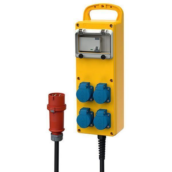 MENNEKES Leiste EverGUM tragbar anschlussfertig verdrahtet Schutzart IP 44 Gehaeuse: 1 Vollgummi-Gehaeuse 370x135x95 mm(LxBxH) signalgelb RAL 1003, mit Traggriff Absicherung unter transparenter Betaetigungsklappe Bestueckung/Absicherung: 4 SCHUKO-Steckdosen 16A 2p+E 230V 1 FI-Schutzschalter 40A 4p IFN=0,03A Zuleitung/Anschlussmoeglichkeit: 1 M 25 mit Verschraubung und Knickschutzspirale 2m Zuleitung H07RN-F5G2,5 mm² und CEE-Stecker 16A 5p 400V