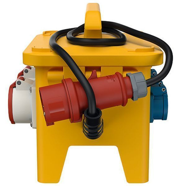 MENNEKES Verteiler EverGUM compact, tragbar anschlussfertig verdrahtet Schutzart IP 44 Gehäuse: 1 Vollgummi-Gehäuse 306x230x288 mm(LxBxH) signalgelb RAL 1003, stapelbar, mit Traggriff Absicherung unter anscharniertem Gehäusedeckel mit Edelstahl-Schnellverschluss, abschließbar Bestückung/Absicherung: Pos.01 2 CEE-Steckdosen 16A 5p 400V Pos.02 4 SCHUKO-Steckdosen 16A 2p+E 230V 2 LS-Schalter 16A 1p B Pos.01-02 1 FI-Schutzschalter 40A 4p IFN=0,03A Zuleitung/Anschlussmöglichkeit: 1 M 25 mit Verschraubung und Knickschutzspirale 2m Zuleitung H07RN-F5G2,5 und CEE-Stecker 16A 5p 400V
