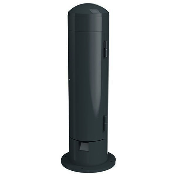 aus Stahlrohr, Wandstärke 4,5 mm, feuerverzinkt, gelb chromatiert und pulverbeschichtet, Farbe: anthrazit (RAL 7016), anscharnierte Versorgungsöffnungen mit Profilhalbzylinderschloss, Maße (H x Ø): 1050 x 273 mm (innen), Gewicht: ca. 60 kg, Leitungsauslass unten: (H x B) 60 x 70 mm, Bodenmontageflansch: Ø 390 mm, 4 Befestigungsbohrungen 15,5 mm, zur Befestigung auf vorhandenem Fundament.