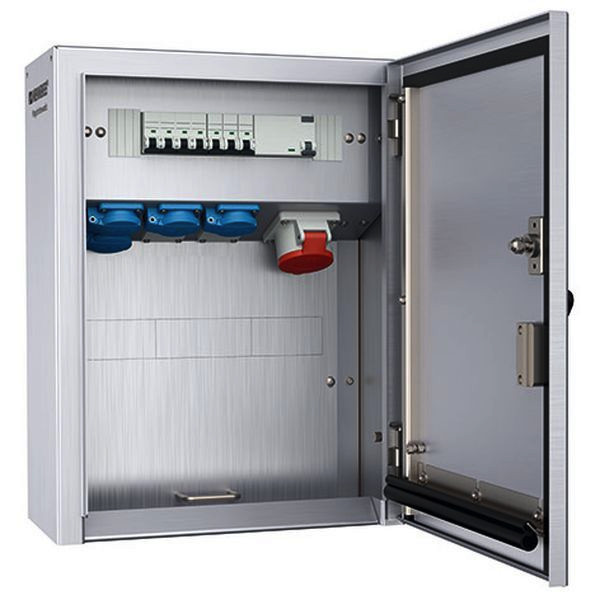 MENNEKES Aufputz-Verteiler Schutzart IP 44 Gehaeuse: 1 Edelstahlgehaeuse, 1.4301 geschliffen, K240 530x400x220 mm (HxBxT) Bestueckung/Absicherung: Pos.01 1 CEE-Steckdose 16A 5p 400V 1 LS-Schalter 16A 3p C Pos.02 4 SCHUKO-Steckdosen 16A 2p+E 230V 4 LS-Schalter 16A 1p B Pos.01-02 1 FI-Schutzschalter 40A 4p IFN=0,03A Leitungseinfuehrung/Anschlussmoeglichkeit: 2 x Einsteckdichtungen M32 unten; 2 x Messing - Verschlussschrauben M16 unten Klemme fuer 2 Leitungen bis 5 x 25 mm² Fronttuer mit Schwenkhebelgriff und Profilhalbzylinder Bei gesteckten Steckern abschliessbar;