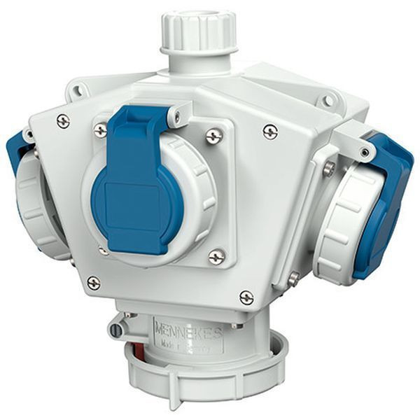 Mennekes DELTABOX anschlussfertig verdrahtet Schutzart IP 67 Gehaeuse: 1 Polycarbonat-Gehaeuse elektrograu RAL 7035 Bestueckung: Pos.01 1 CEE-Steckdose 16A 5p 400V Pos.02 3 SCHUKO-Steckdosen 16A 2p+E 230V Leitungseinfuehrung/Anschlussmoeglichkeit: 1x M32x1,5 mit Verschraubung Klemme fuer 1 Leitung bis 5 x 6 mm² mit innenliegender Zugentlastungsschelle und montiertem Aufhaengehaken 1 Aufhaengebuegel (lose)