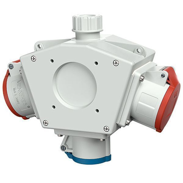 MENNEKES DELTABOX anschlussfertig verdrahtet Schutzart IP 44 Gehaeuse: 1 Polycarbonat-Gehaeuse elektrograu RAL 7035 Bestueckung: Pos.01 2 CEE-Steckdosen 16A 5p 400V - rechts und links - Pos.02 1 CEE-Steckdose 16A 3p 230V - unten - Leitungseinfuehrung/Anschlussmoeglichkeit: 1x M32x1,5 mit Verschraubung Klemme fuer 1 Leitung bis 5 x 6 mm² mit innenliegender Zugentlastungsschelle und montiertem Aufhaengehaken 1 Aufhaengebuegel (lose)