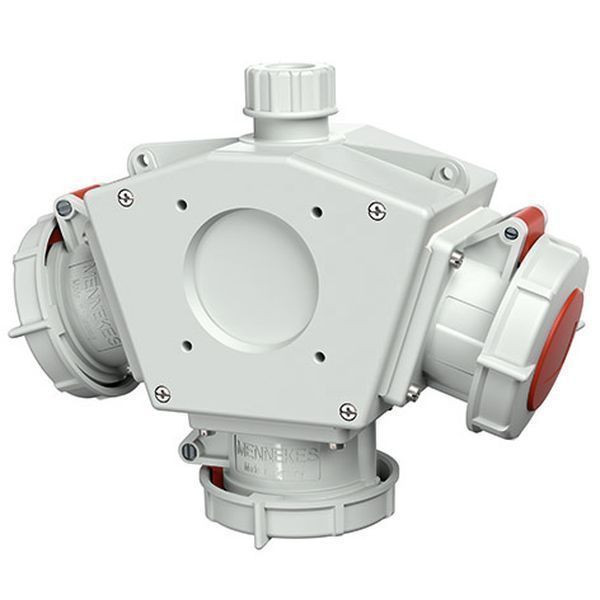 MENNEKES DELTABOX anschlussfertig verdrahtet Schutzart IP 67 Gehaeuse: 1 Polycarbonat-Gehaeuse elektrograu RAL 7035 Bestueckung: 3 CEE-Steckdosen 16A 5p 400V ( 228) Leitungseinfuehrung/Anschlussmoeglichkeit: 1x M32x1,5 mit Verschraubung mit innenliegender Zugentlastungsschelle und montiertem Aufhaengehaken 1 Aufhaengebuegel (lose) Klemme fuer 1 Leitung bis 5 x 6 mm²
