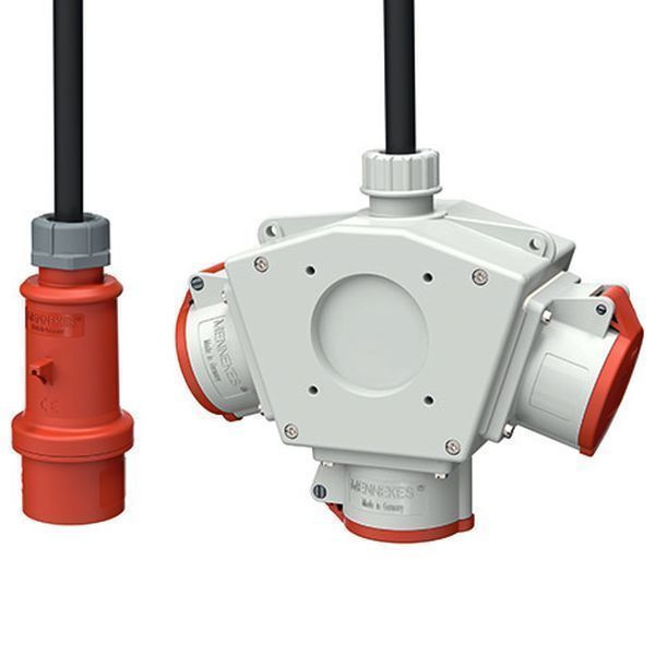 MENNEKES DELTABOX anschlussfertig verdrahtet Schutzart IP 44 Gehaeuse: 1 Polycarbonat-Gehaeuse elektrograu RAL 7035 Bestueckung: Pos.01 3 CEE-Steckdosen 16A 5p 400V Zuleitung/Anschlussmoeglichkeit: 1x M32x1,5 mit Verschraubung 2m Zuleitung HO7RN-F5G2,5 mit CEE-Stecker 16A 5p 400V mit innenliegender Zugentlastungsschelle und montiertem Aufhaengehaken 1 Aufhaengebuegel (lose)