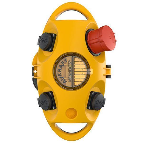 1 x CEE-Steckdose, 400 V MENNEKES AirKRAFT Anschlussfertig verdrahtet Schutzart IP 44 Gehaeuse: 1 AMAPLAST-Gehaeuse schwarz (aehnlich Ral 9005) und anscharniertem Geraetedeckel (gelb) Absicherung unter transparenter Betaetigungsklappe Bestueckung:/Absicherung: Pos.01 1 CEE-Steckdose 16A 5p 400V Pos.02 3 Schuko-Steckdosen 16A 2p+E 230V ohne Absicherung Leitungseinfuehrungen: oben verschlossen, zum Ausbrechen 1x M32, 1x M25, 2x M20 1x Durchfuehrung fuer Druckluftanschluss seitlich verschlossen zum Ausbrechen 1x M25 einschl. Montageoesenset (102070)