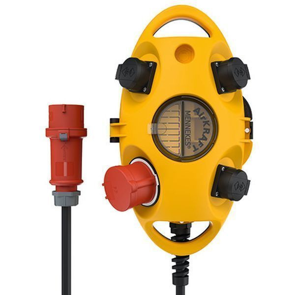 MENNEKES AirKRAFT Anschlussfertig verdrahtet Schutzart IP 44 Gehaeuse: 1 AMAPLAST-Gehaeuse schwarz (aehnlich RAL 9005) und anscharniertem Geraetedeckel (gelb) Absicherung unter transparenter Betaetigungsklappe Bestueckung/Absicherung: Pos.01 1 CEE-Steckdose 16A 5p 400V Pos.02 3 Schuko-Steckdosen 16A 2p+E 230V ohne Absicherung Einspeisung/Anschlussmoeglichkeit: 3m Zuleitung H07RN-F5G2,5 und CEE-Stecker 16A 5p 400V 1x Durchfuehrung fuer Druckluftanschluss seitlich verschlossen, zum Ausbrechen 1x M25