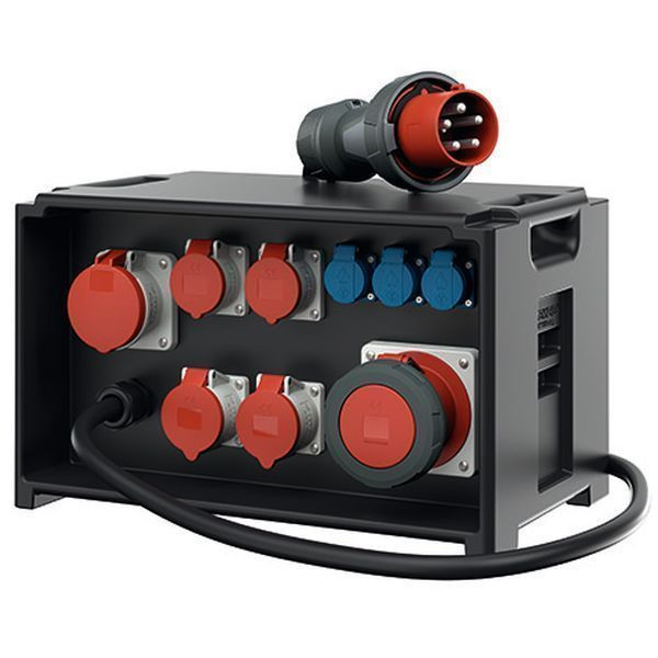 MENNEKES mobiler Verteiler anschlussfertig verdrahtet Schutzgrad IP 44 Gehaeuse: 1 PE-Gehaeuse 560 x 350 x 340 mm (L x B x H) schwarz RAL 9005, stapelbar, mit Tragegriffen Absicherung unter transparenten Betaetigungsklappen Bestueckung/Absicherung: Pos. 01 1 CEE-Steckdosen 125A 5p 400V Pos. 02 1 CEE-Steckdosen 63A 5p 400V Pos. 03 2 CEE-Steckdosen 32A 5p 400V 2 LS-Schalter 32A 3p C Pos. 04 2 CEE-Steckdosen 16A 5p 400V 2 LS-Schalter 16A 3p C Pos. 05 3 SCHUKO-Steckdosen 16A 2p+E 230V 3 LS-Schalter 16A 1p C Pos. 02+04 1 FI-Schutzschalter 63A 4p IFN= 0,03 A 1 LS-Schalter 63A 3p C Pos. 03+05 1 FI-Schutzschalter 63A 4p IFN= 0,03 A 1 LS-Schalter 63A 3p C Zuleitung/Anschlussmoeglichkeit: 2 m Zuleitung H07RN-F5G25 und 1 CEE-Stecker 125A 5p 400V