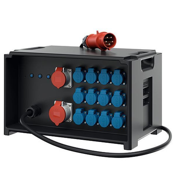 MENNEKES mobiler Verteiler anschlussfertig verdrahtet Schutzgrad IP 44 Gehaeuse: 1 PE-Gehaeuse 560 x 350 x 340 mm (L x B x H) schwarz RAL 9005, stapelbar, mit Tragegriffen Absicherung unter transparenten Betaetigungsklappen Bestueckung/Absicherung: Pos. 01 1 CEE-Steckdose 32A 5p 400V Pos. 02 1 CEE-Steckdose 16A 5p 400V 1 LS-Schalter 16A 3p C Pos. 03 12 SCHUKO-Steckdosen 16A 2p+E 230V 12 LS-Schalter 16A 1p C Pos. 04 3 Phasenkontollleuchten "gruen" Pos. 01-04 1 FI-Schutzschalter 40A 4p IFN= 0,03 A Einspeisung/Anschlussmoeglichkeit: 2 m Zuleitung H07RNF-5G6 1 CEE-Stecker 32A 5p 400V IP 44