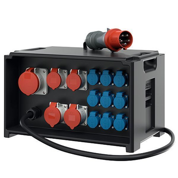 MENNEKES mobiler Verteiler anschlussfertig verdrahtet Schutzgrad IP 44 Gehaeuse: 1 PE-Gehaeuse 560 x 350 x 340 mm (L x B x H) schwarz RAL 9005, stapelbar, mit Tragegriffen Absicherung unter transparenten Betaetigungsklappen Bestueckung/Absicherung: Pos. 01 1 CEE-Steckdose 63A 5p 400V Pos. 02 2 CEE-Steckdosen 32A 5p 400V 2 LS-Schalter 32A 3p C Pos. 03 2 CEE-Steckdosen 16A 5p 400V 2 LS-Schalter 16A 3p C Pos. 04 9 SCHUKO-Steckdosen 16A 2p+E 230V 9 LS-Schalter 16A 1p C Pos. 01-04 1 FI-Schutzschalter 63A 4p IFN= 0,03 A Einspeisung/Anschlussmoeglichkeit: 2 m Zuleitung HO7RNF-5G10 1 CEE-Stecker 63A 5p 400V IP 44