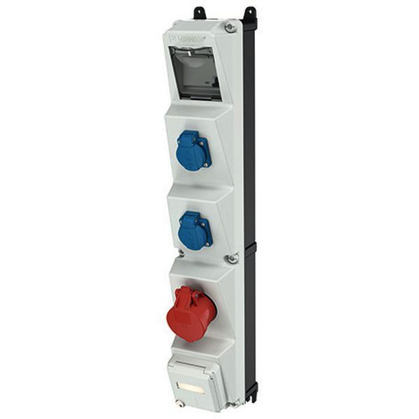 MENNEKES Steckdosen-Kombination AMAXX S anschlussfertig verdrahtet Schutzgrad IP 44 Gehaeuse: 1 AMAPLAST-Gehaeuse 650x113 mm (HxB) Unterteil schwarz Oberteil elektrograu RAL 7035 Absicherung unter transparenter Betaetigungsklappe Bestueckung/Absicherung: Pos. 01 1 CEE-Steckdose 16A 5p 400V Rapido Pos. 02 2 SCHUKO-Steckdosen 16A 2p+E 230V Pos. 03 1 RJ45 2fach Datenanschlussdose Cat. 6 bei gesteckten Steckern abschliessbar (Gleiche Schliessung) Pos. 01-02 1 FI-Schutzschalter 40A 4p IFN = 0,03 A Leitungseinfuehrung/Anschlussmoeglichkeit: 1 M 32 oben (offen) 1 M 32 unten (verschlossen) je 1 M 20 oben und unten rechts (verschlossen) fuer 1 Leitung bis 5 x 10 mm² - max. bauseitige Vorsicherung 16A -