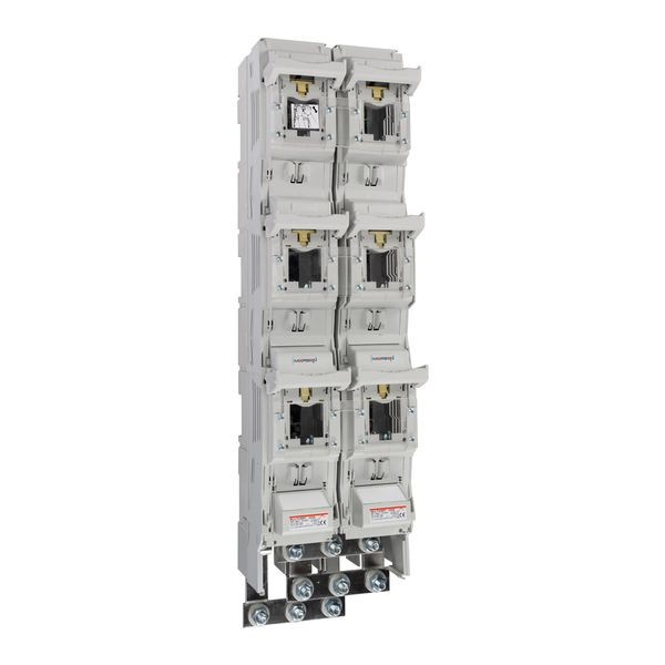 MULTIVERT NH-Sicherungs-Lastschaltleisten erfüllen sämtliche Funktionen eines NH-Sicherungs-Lasttrennschalters. Die Konstruktion ist für die Direktmontage auf Sammelschienen in dreipoliger Anordnung ausgelegt. MULTIVERT Doppelschaltleisten können auf 185mm Sammelschienen-Systemen direkt montiert werden und sind in den Bauweisen MULTIVERT 800A (2 x 400A) und MULTIVERT 1260A (2 x 630A) erhältlich. Sie sind für NH-Sicherungs-Einsätze nach IEC/EN 60269-2, VDE 0636-2, Größe 2: 400A und Größe 3: 630A entwickelt. Das System ist ein Modulsystem, in dem die verschiedenen Produkte optimal kombiniert werden können. MULTIVERT ermöglichen dem Anwender eine rasche und einfache Installationsmöglichkeit sowie hohe Sicherheit bei der Installation und Wartung. Montage auf 185mm Sammelschienen-System, symmetrische Schaltleiste - Kabelabgang oben/unten bei Einbau wählbar, Berührungsschutz IP 30 mit Zentralabdeckung, Leitungsanschlussvarianten: 3 fach Kabelanschluss mit Bolzen M12 - geeignet für 1600A bei Einsatz von besonderen Trennmessern Größe 3, 1000A, Artikel 33SZSM2.