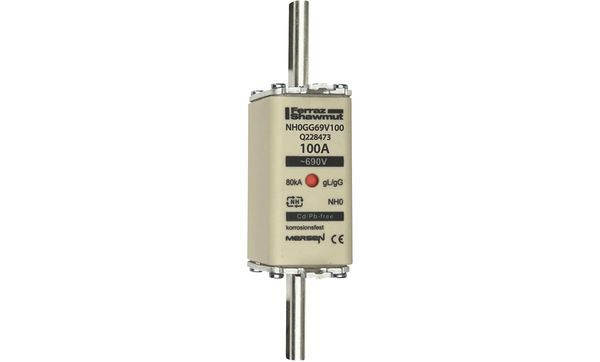 | Kurzbeschreibung | Sicherungseinsatz NH gG Gr.0 AC690V DC400V 100A mit spannungsführenden Grifflaschen sfü und Doppelkennmelder |