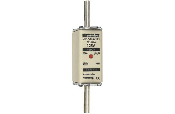 | Kurzbeschreibung | Sicherungseinsatz NH gG Gr.1 AC690V DC400V 125A mit spannungsführenden Grifflaschen sfü und Doppelkennmelder |