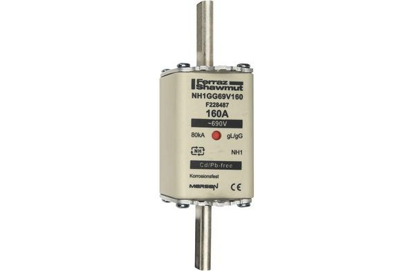 | Kurzbeschreibung | Sicherungseinsatz NH gG Gr.1 AC690V DC400V 160A mit spannungsführenden Grifflaschen sfü und Doppelkennmelder |