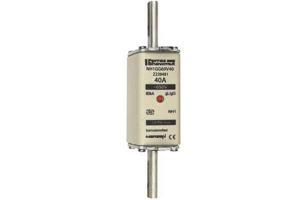 | Kurzbeschreibung | Sicherungseinsatz NH gG Gr.1 AC690V DC400V 40A mit spannungsführenden Grifflaschen sfü und Doppelkennmelder |