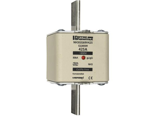 | Kurzbeschreibung | Sicherungseinsatz NH gG Gr.3 AC690V 425A mit spannungsführenden Grifflaschen sfü und Doppelkennmelder |