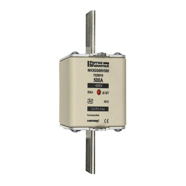 | Kurzbeschreibung | Sicherungseinsatz NH gG Gr.3 AC690V 500A mit spannungsführenden Grifflaschen sfü und Doppelkennmelder |