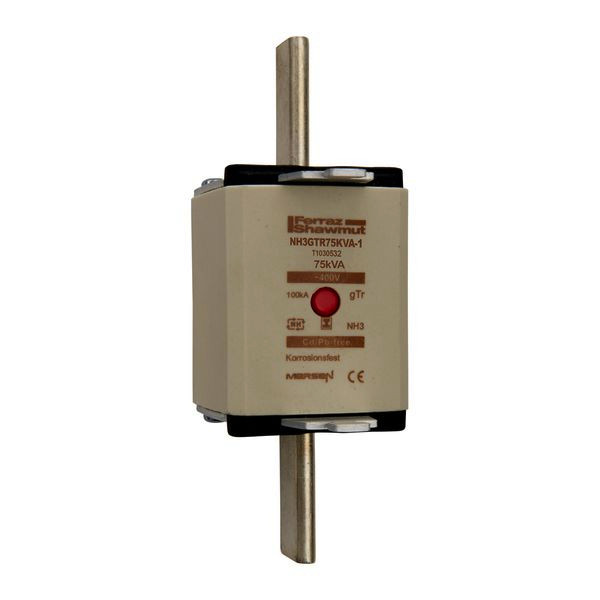 | Kurzbeschreibung | Sicherungseinsatz NH gTr Gr.3 AC400V 75kVA 108A mit spannungsfreien Grifflaschen SGL und Mittenkennmelder |