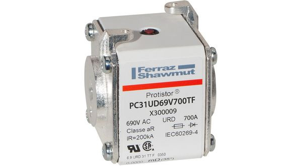 Mersen Protistor Sicherungseinsätze 690/700V für den Halbleiterschutz berücksichtigen ein breites Maß an Flexibilität bei der Anwendung zum Schutz von modernen Stromrichtergeräten. Es handelt sich um eine superflinke Reihe, die in ihrer Gesamtheit befähigt ist, Leistungshalbleiter wie z.B. Dioden, Thyristoren und IGBT Bauelemente zu schützen. Protistor Sicherungseinsätze in verschiedenen Baugrößen und zahlreichen Nennströmen ermöglichen eine weitestgehende Geräteanpassung. Die Sicherungen enthalten, in Sand fest eingebettet, Schmelzleiter, um sehr gute Gesamtabschaltintegrale (I2t) und hohe Schaltvermögen zu gewährleisten. Die Kontaktoberflächen sind versilbert und alle Bauteile nichtmagnetisch. Es gibt bei allen Sicherungen dieser Reihe einen Funktionsmelder, der neben seiner visuellen Anzeigefunktion auch dazu benutzt werden kann, mittels eines zusätzlichen Mikroschalters die Sicherungsfunktion fern zu melden.