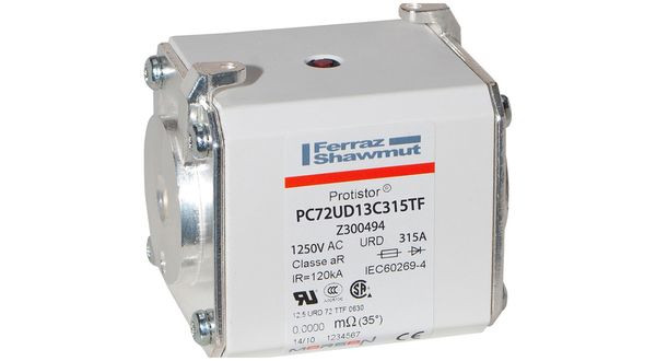 Mersen Protistor Sicherungseinsätze 1250/1300V für den Halbleiterschutz berücksichtigen ein breites Maß an Flexibilität bei der Anwendung zum Schutz von modernen Stromrichtergeräten. Es handelt sich um eine superflinke Reihe, die in ihrer Gesamtheit befähigt ist, Leistungshalbleiter wie z.B. Dioden, Thyristoren, MOSFET und IGBT Bauelemente zu schützen. Protistor Sicherungseinsätze in verschiedenen Baugrößen und zahlreichen Nennströmen ermöglichen eine weitestgehende Geräteanpassung. Die Sicherungen enthalten in Sand fest eingebettete Schmelzleiter, um sehr gute Gesamtabschaltintegrale (I2t) und hohe Schaltvermögen zu gewährleisten. Die Kontaktoberflächen sind versilbert und alle Bauteile nichtmagnetisch. Es gibt bei allen Sicherungen dieser Reihe einen Funktionsmelder, der neben seiner visuellen Anzeigefunktion auch dazu benutzt werden kann, mittels eines zusätzlichen Mikroschalters die Sicherungsfunktion fern zu melden. Die Sicherungen verfügen über ein M10 Gewindeanschluss.