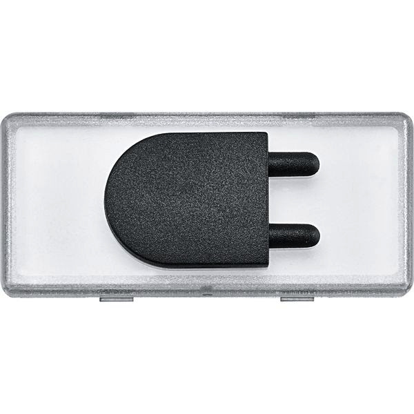 Für Wippen und Steckdosen mit großem Schriftfeld. Das bestehende Schriftfeld wird durch das tastbare Kontrast-Symbol ausgetauscht. Ausführung Steckdose, glasklar.
