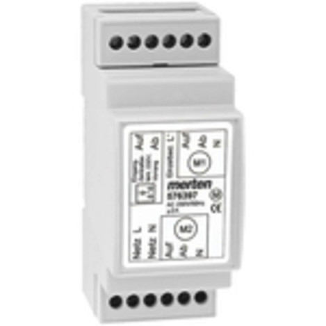 zur Steuerung von bis zu 2 Rollladenmotoren vor Ort, in Gruppen oder zentral, mit Trennung von Last- und Steuerkreis sowie Zwangsverriegelung in beiden Laufrichtungen, Einzelbedienung der Motoren erfolgt über einen Rollladen-Wipptaster, zentrale Steuerungen über Jalousie-Zeitschaltuhren oder Jalousie-Taster des Merten-Jalousiesteuerungssystems, für die Montage auf Hutschienen TH35 nach EN 60715, Schaltstrom: max. 2 A, Temperaturbereich: 0-60 °C. Klemmen: max. 1,5 mm2, Gerätebreite: 2 TE = ca. 36 mm