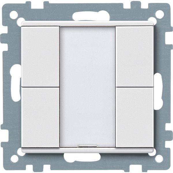 inkl. Putzschutzhaube und Busanschlussklemme Im Design System M. Mit integriertem Busankoppler. Taster mit 4 Bedientasten, Betriebs-, Statusanzeige und Schriftfeld. Die Betriebsanzeige kann auch als Orientierungslicht verwendet werden. Das Gerät wird über eine Busanschlussklemme mit der Busleitung verbunden. Softwarefunktionen KNX Schalten, Umschalten, Dimmen (ein-/zweiflächig), Jalousie (ein-/zweiflächig). Flanken löst 1,- 2-, 4- oder 8-Bit-Telegramme aus (Unterscheidung kurze/lange Betätigung). Flanken mit 2-Byte-Telegrammen (Unterscheidung kurze/lange Betätigung), 8-Bit-Schieberegler, Szenenabruf, Szenenspeicherung, Sperrfunktionen. Zubehör Beschriftungsbogen für Taster 6183xx Lieferumfang Mit Putzschutzhaube. Mit Busanschlussklemme. Material Thermoplast edelmatt. Farbe polarweiß.