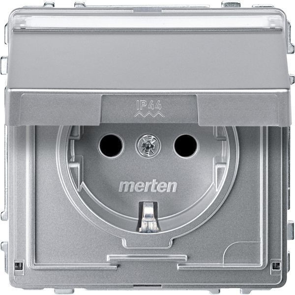 | Kurzbeschreibung | SCHUKO-Steckdose mit Klappdeckel und Schriftfeld, Berührungsschutz, Steckklemmen, aluminium, AQUADESIGN |