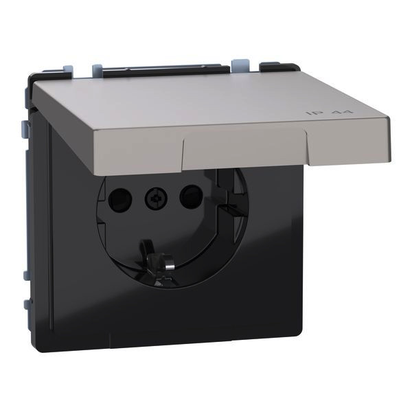 | Kurzbeschreibung | SCHUKO-Steckdose mit Klappdeckel, IP44, Berührungsschutz, Steckklemmen Nickelmetallic, System Design |