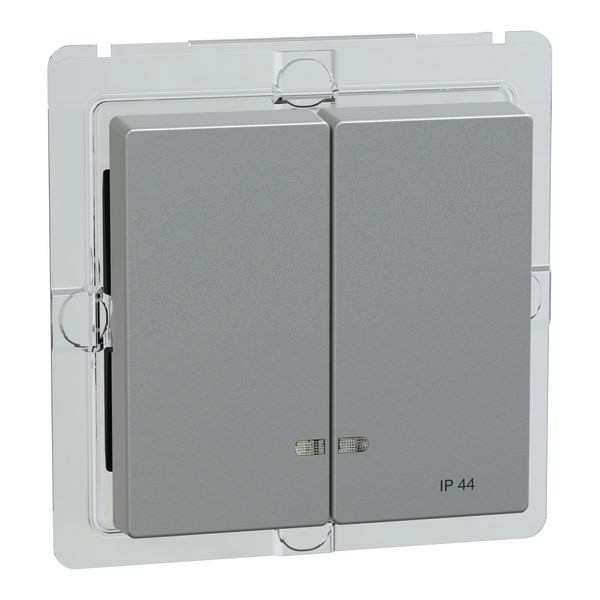 Für Serien- und Doppeltaster-Einsatz. Schutzart IP 44 Spritzwassergeschützt. Zu komplettieren mit Schalter und Taster, 2-fach. Material Thermoplast edelmatt. Farbe aluminium.